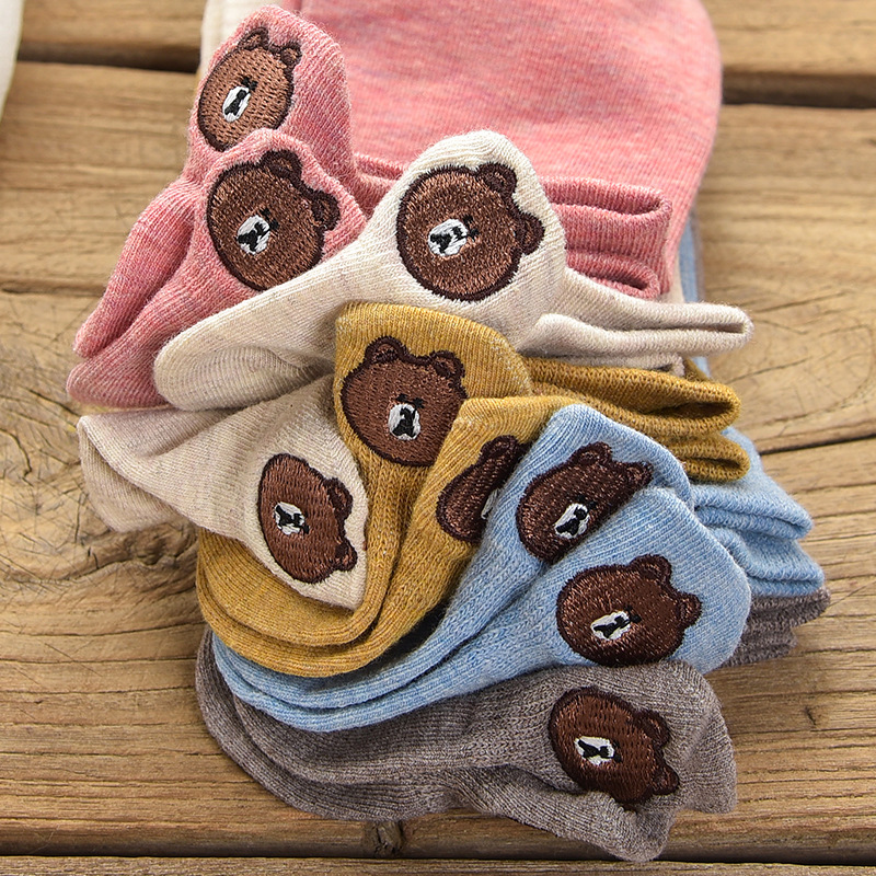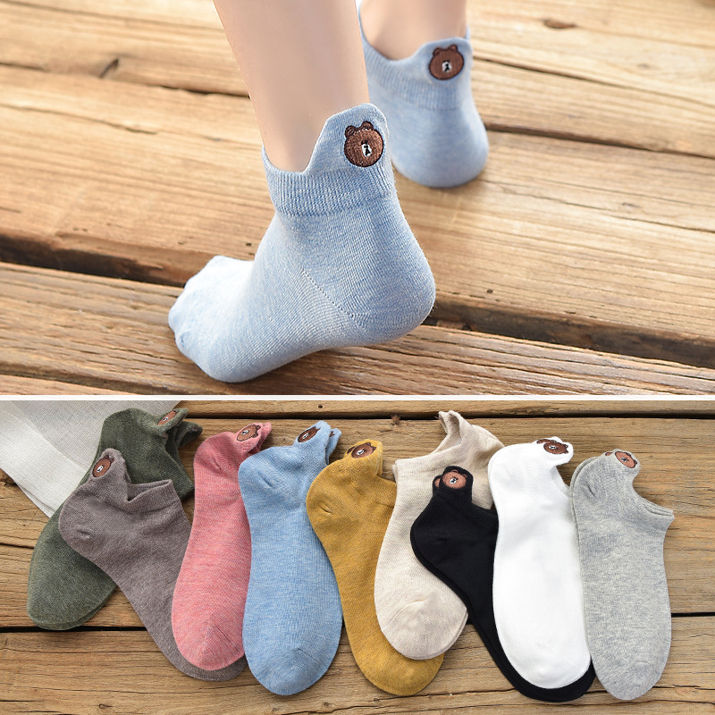 (10 pairs)Woman Cute Embroidered Cartoon Bear Cotton Socks Kawaii Candy Color Breathable Comfortable Boat Socks Female Casual Sock Ladies Ankle Socks