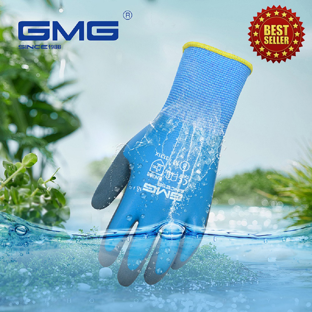 GMG safety gloves waterproof work gloves blue Polyester good adhesion wear resistant durable grey latex safety gloves work gloves good quality