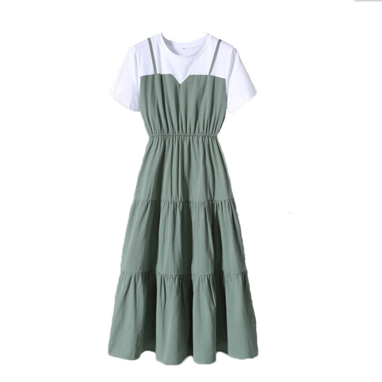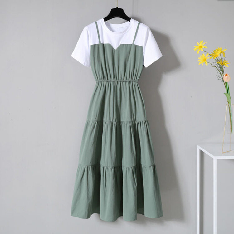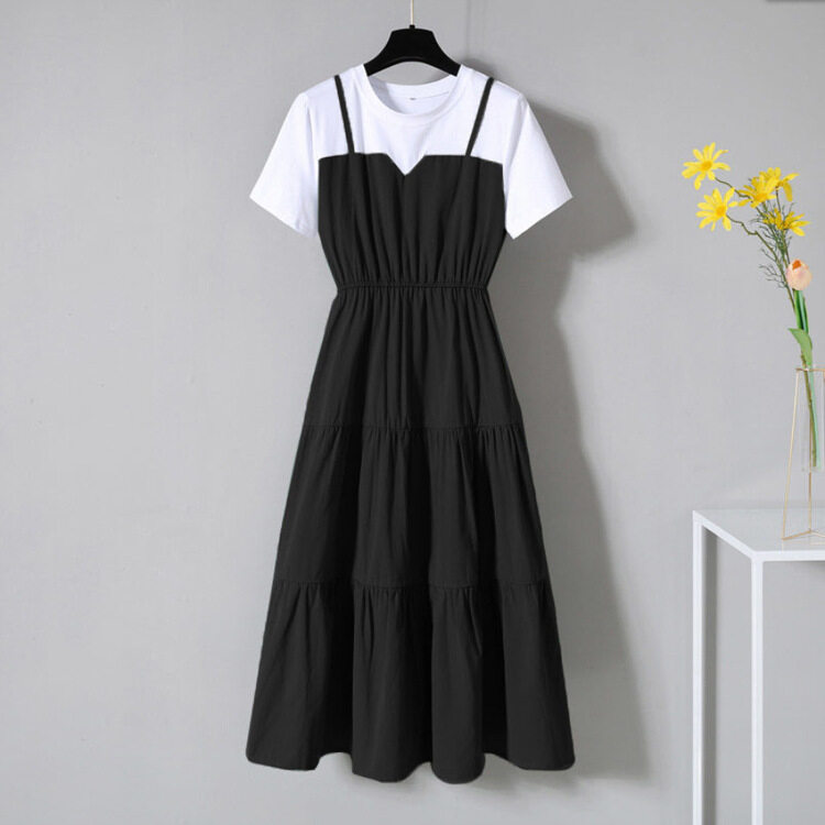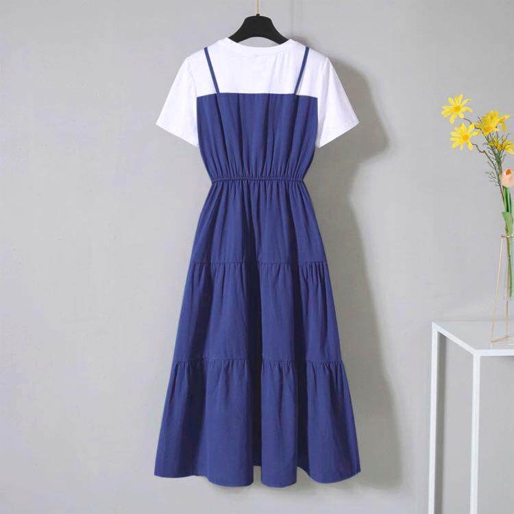 Large size dress women's summer Korean fake two-piece dress age-reducing short sleeve round neck A-line skirt slim mid-length skirt
