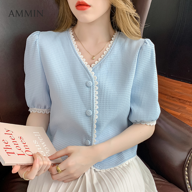 AMMIN Korean style ladies all-match elegant design sense waffle lace stitching short-sleeved Blouse fashionable temperament gentle style V-neck puff sleeve top