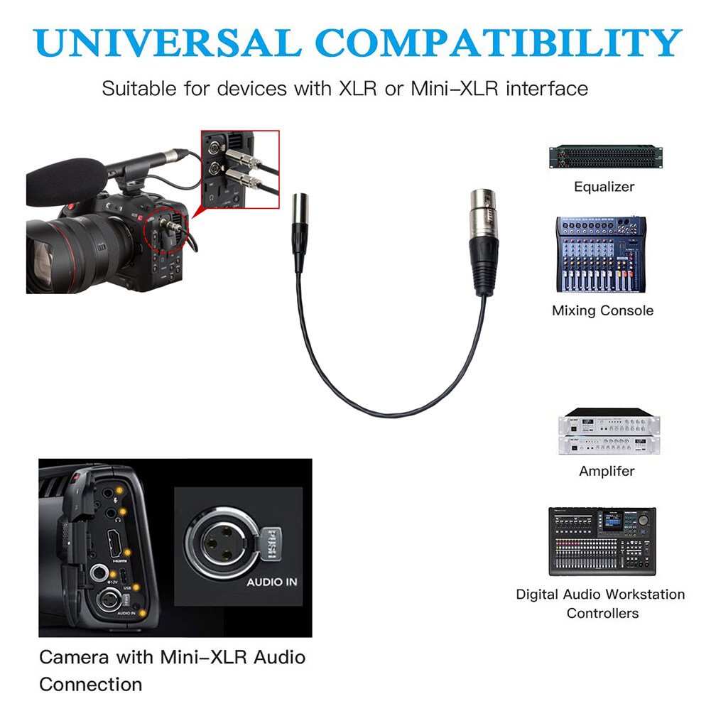 The mini XLR 3pin plug can be converted to a standard XLR 3pin female connector, which can be connected to a standard microphone. Widely used in various cameras, SLR cameras, professional photography equipment, BMPCC 4K BMPCC 6K series professional camera for microphone adapter.