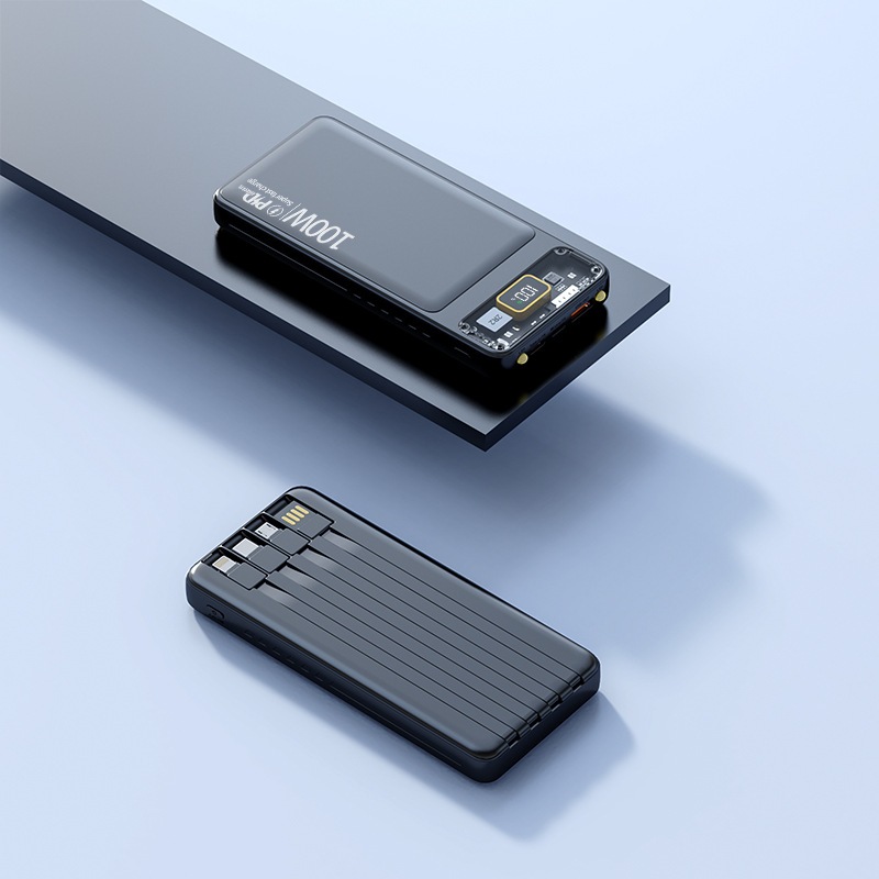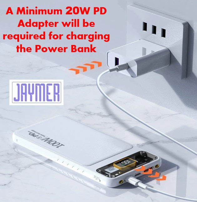 A minimum 20W PD adapter and fast charging cable is recommended for charging the power bank