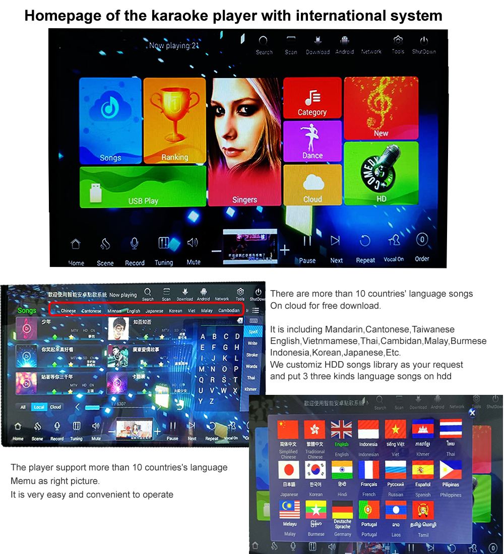 3.Download songs from cloud.There are more than 300K differentlanguage songs(Mandarin,Cantonese,Taiwanese,Vietnamese,English,Korean,Japanese,Thai,Burmese,Malay,Filipino,Spanish,etc. More than 10 kinds of songs on cloud ) on Cloud for download.The system updatessongs each every week.It will hint Synchronize new updates cloud songs if there are new songs.