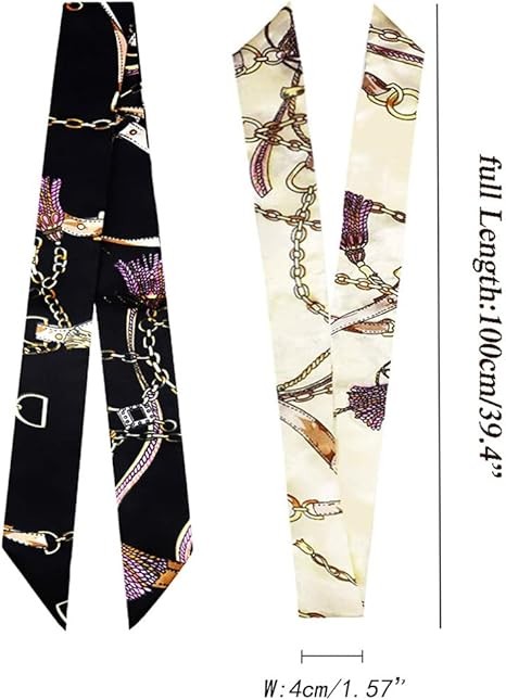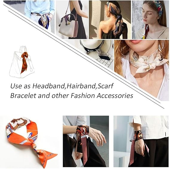 Material: Imitation silk, feels great. Practical and easy to clean. High-quality silk scarves for handbag decorative ribbons.