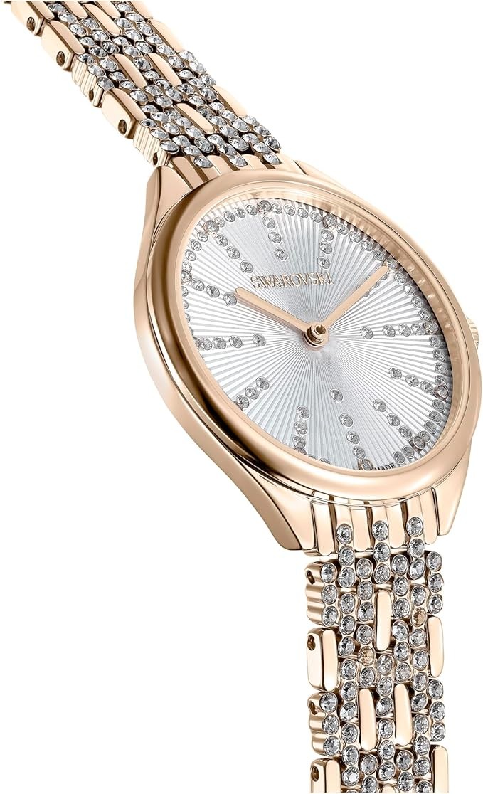 • Items delivered: (1) Swarovski Attract watch with guilloché dial and PVD-coated stainless steel casing on a champagne gold-tone finish metal band, complete with Swarovski watch box